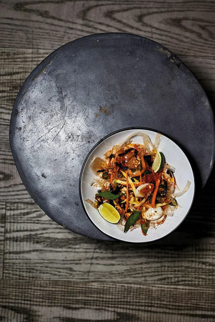 越南人喜欢用米纸做春卷,剩下来的米纸边角料和其他佐料混合在一起制作成Banh Trang Tron(越南米纸沙拉)。这是越南很常见的街边小吃,它非常容易做也非常便宜,但是味道非常丰富,所以孩子们总是将它作为下午放学的零食。他生长在大叻郊外的小村庄,这就是他从小的记忆,也是现在孩子们一直在吃的东西。孩子们通常都是用塑料袋装,再用竹签取出,放学回家时就在路上这样吃。里面有花生、芒果、草药,再与辣椒混在一起,稍微贵点的会放些干肉,通常是牛肉。因为它是街边小吃,很少有餐厅会供应。所以许多外国人并不知道这道菜肴。我用更好的烹饪技术,用了更好的食材,例如新鲜的草药、坚果、红葱、干虾,并加入了鹌鹑蛋、挪威三文鱼籽,让它变得更现代、更高档。