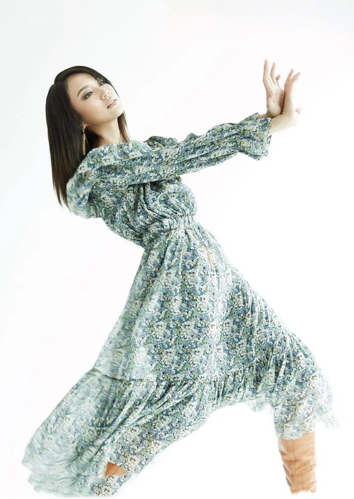 丝质雪纺花卉图案裙子,耳环,皮靴/Celine。