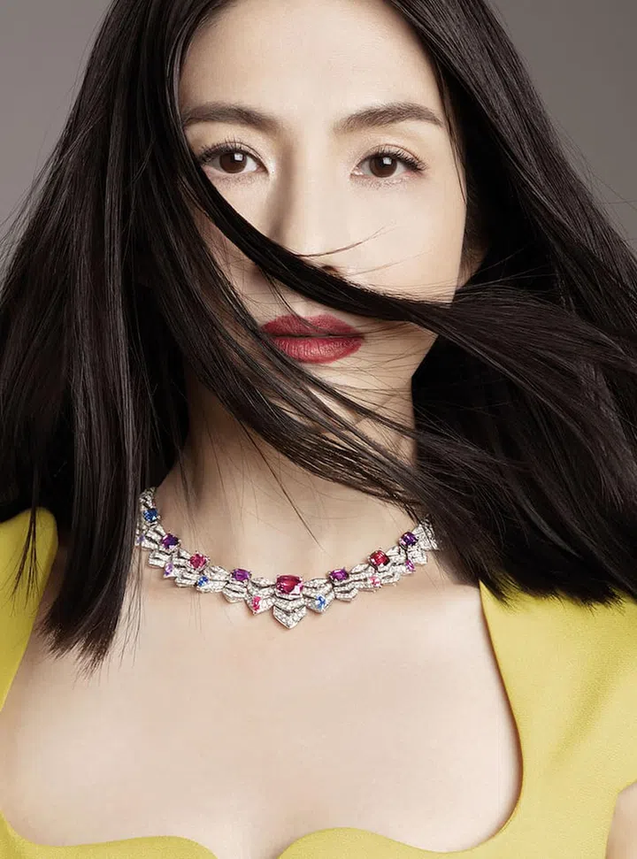 高级珠宝项链,白金镶嵌枕形尖晶石、梨形尖晶石和密镶钻/Bvlgari。真丝绉纱连衣裙/Versace。