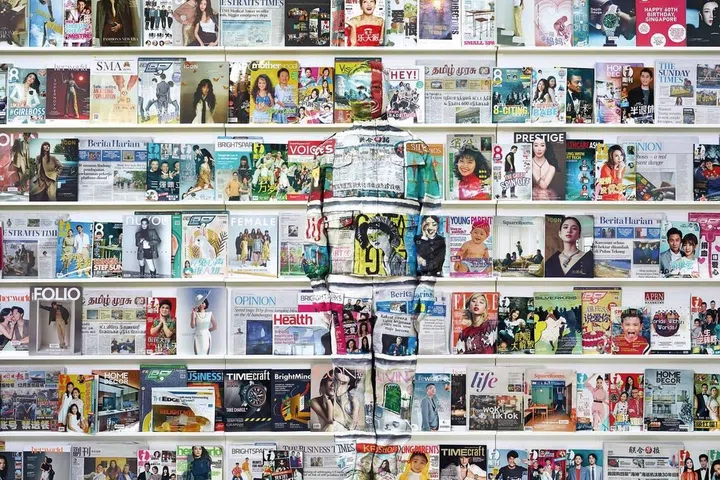 刘勃麟的创作不仅回应社会议题,有时也记录着消失中的时代。这次在本地创作的 “Magazine Rack – Singapore Chapter”以杂志架为背景,本地团队搜集逾百本曾在新加坡发行的杂志,其中包括《风华》(ICON),搭建出3米乘6米的拍摄背景。杂志架上的许多杂志都已停刊,反映着纸媒时代的退场,也让作品多了一层历史感。