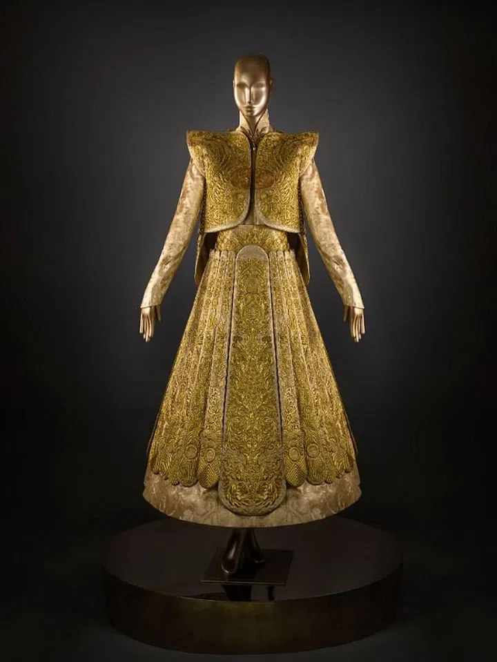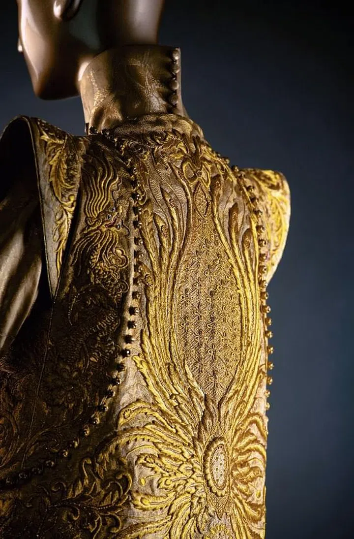 这件“黄金嫁衣”历时五年完成,裙身与衣面上的精细刺绣充满吉祥寓意。