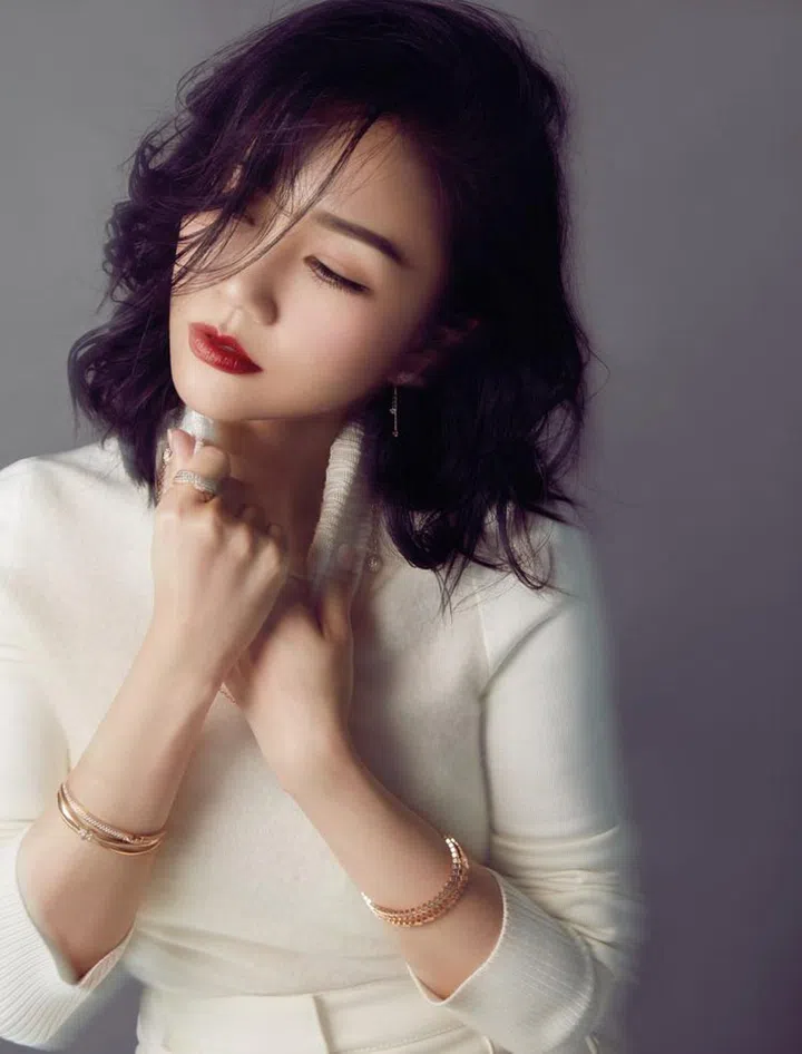 时尚:毛料裙子/Gucci。 珠宝:Bee My Love系列18K白金镶嵌明亮式切割钻石手镯和单钻戒指,Liens Evidence系列18K白金镶嵌明亮式切割钻石手镯,Liens Seduction系列18K白金镶嵌明亮式切割钻石戒指/Chaumet。
