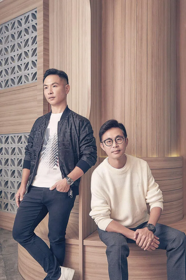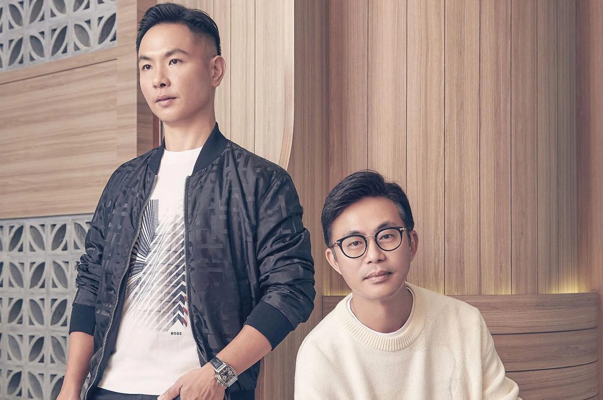 左:郑友贤 Victor Tay; 棉质T恤、黑色牛仔裤和涤纶外套。右:华峻兴 Alan Wah; 棉质套头衫、羊毛棉质裤子/Boss。