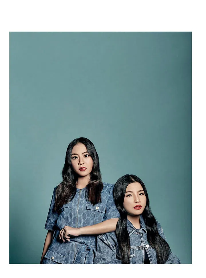 (Miranda Kuek)带皮带丹宁连身裙/Sandro;(Rosanna Kuek)丹宁夹克、针织上衣和真丝蓬蓬裙/Maje。