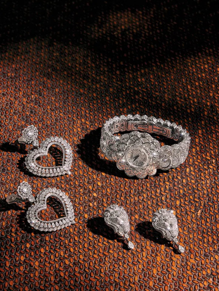 左起顺时针: 萧邦Precious Lace高级珠宝钻石耳环; 香奈儿Lion Venitien白金镶钻耳环; 萧邦Red Carpet高级珠宝系列Waterlily白金镶钻腕表。