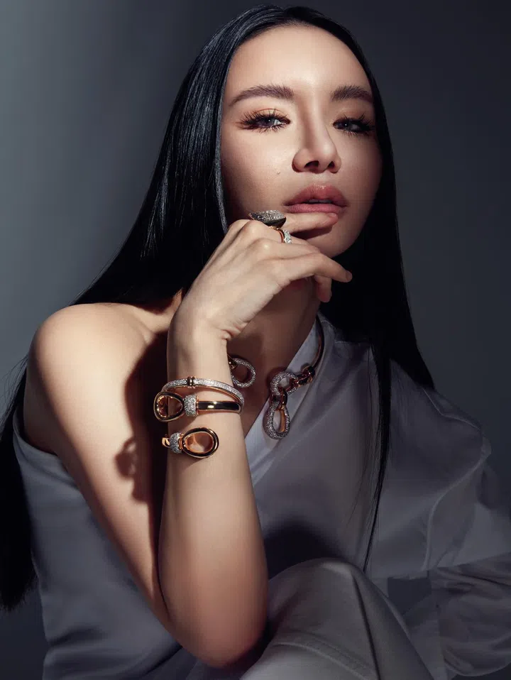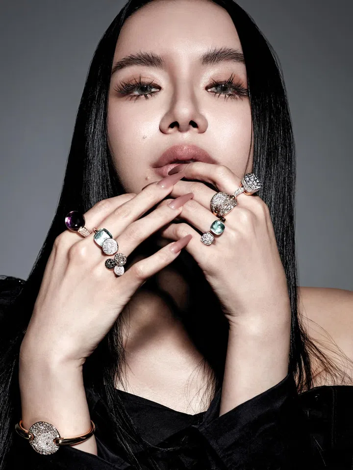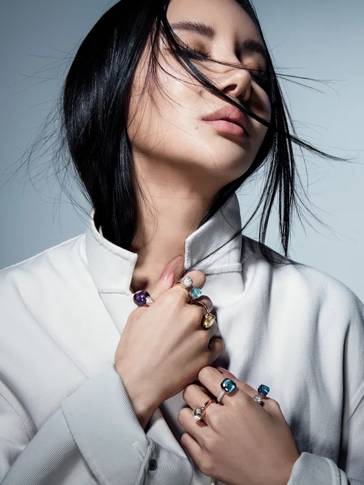 右手左起:Iconica系列紫水晶玫瑰金戒指,镶嵌54颗白钻;Nudo系列天蓝托帕石玫瑰金戒指;Sabbia系列玫瑰金戒指;Sabbia玫瑰金手镯 /Pomellato。
