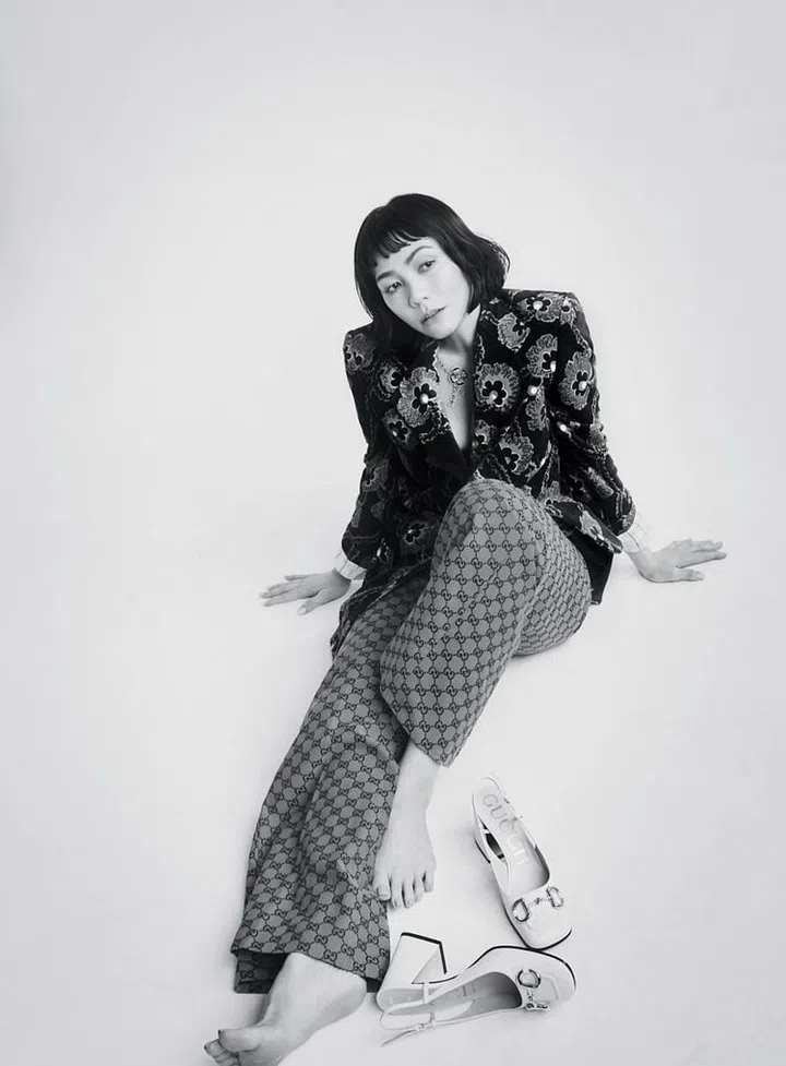 天鹅绒花卉外套、裤子、高跟鞋/Gucci;Fiorever高级珠宝项链/Bvlgari。