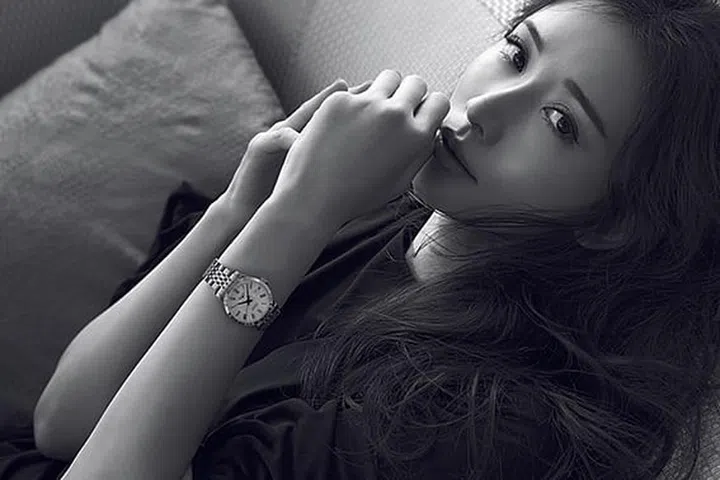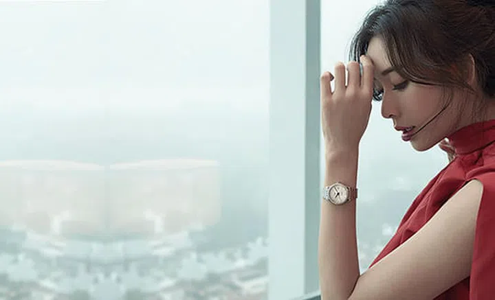 丝质泽西裙/Dior。 Record Collection不锈钢及18克拉粉红金表环腕表/Longines。