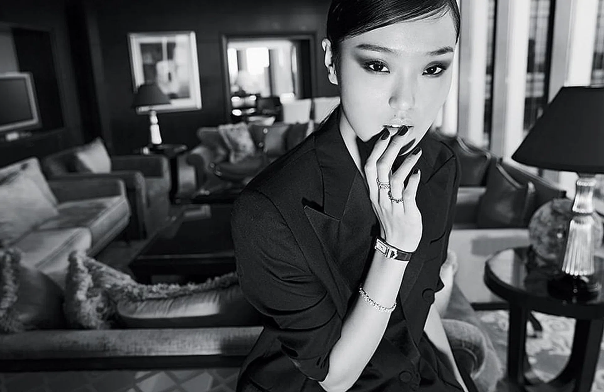 品牌设计总监Tomas Maier 本季迸发出了更多创新火花:烟灰色细褶雪纺裙,还有印有小花图案、质地细腻的缎面打底裙、不同织数的针织打造出的柔软长大衣,结合精致刺绣工艺,那一份低调奢华,正好有Tiffany & Co.高级珠宝为造型画龙点睛,也让极具东方美的韩悦更添了几分高雅的雍容。