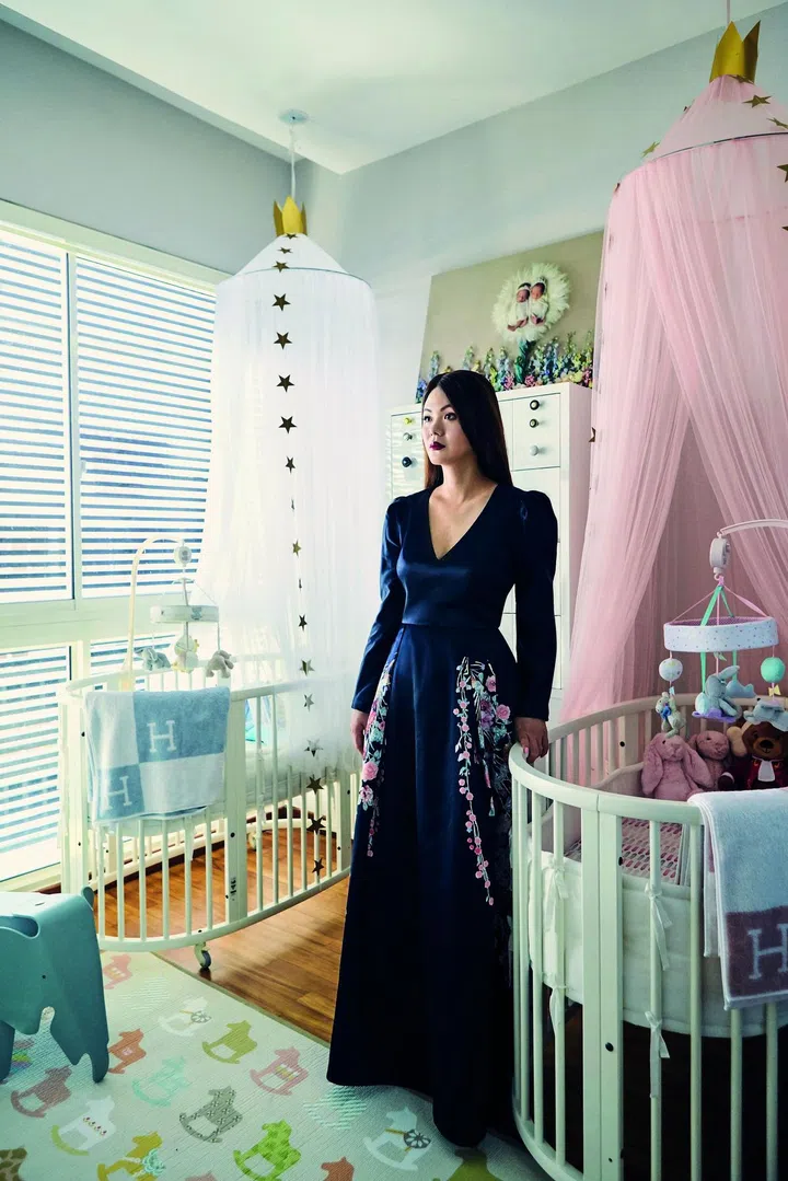 初为人母,Chermaine透露,夫妻俩到目前为止已为儿女增添了不少衣物,预测日后孩子们的衣服和配饰将直逼她在二楼专属的精品时尚空间。她兴奋表示,以后就可以跟孩子一起分享并且共用她多年来搜罗的各式珍藏品。她对爱马仕特别钟爱,拍摄时她特别取出为宝宝们添置的爱马仕(Hermes)婴儿鞋。观察所见,餐厅里的餐具、客厅沙发上的抱枕都是爱马仕精品。她也把对品牌的热爱延伸到婴儿房,宝宝各拥有一张爱马仕的被子,当然,她依据房间主题分别买了粉蓝与粉红色的被子。