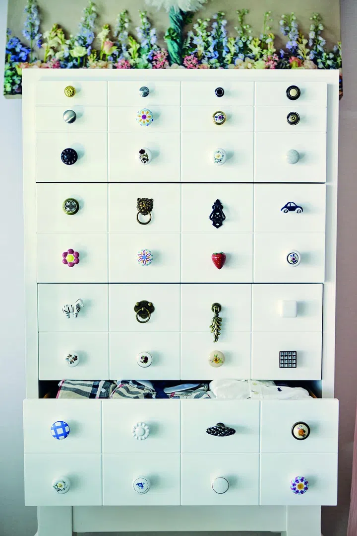 目前仍放产假在家休养的Chermaine恬静笑说:“婴儿房的主题是王子和公主。”幸福美丽的童话故事在此展开,步上三楼推门而入,浓浓的温馨感扑面而来,立刻就能感觉到她为这间婴儿房所投注的心思。Lucas与Leia的婴儿床各占一角,充满着欧洲风的圆顶幔帐以粉嫩的蓝与分红区分。夫妻俩对孩子一视同仁,除了颜色,他们各自拥有同等的物件,其中包括分别拥有一只莫扎特和贝多芬音乐小熊。“我希望从小就开始培养孩子们对音乐的热爱。每晚睡觉前,我都会让他们听音乐。”浓浓的母爱溢于言表。 这件婴儿房虽然不大,但小处见真心,两个婴儿床之间,有一个夫妻俩在欧洲旅行时所看的置屋柜分开来,“这个橱柜的手把非常特别,我们一看就非常喜欢,因此特别从欧洲运回来。”这个柜子目前用来放置一对宝宝的衣服。