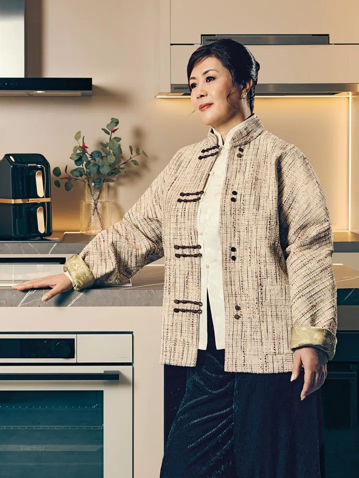 在这次拍摄中,她也尝试用更健康、现代的方式来完成这道家常菜。传统地三鲜的做法,通常要先将马铃薯、茄子和青椒油炸,再与蒜香酱汁翻炒。她选择以空气炸方式处理食材,让蔬菜在保持酥香口感的同时,大大减少油脂,吃起来清爽不油腻。