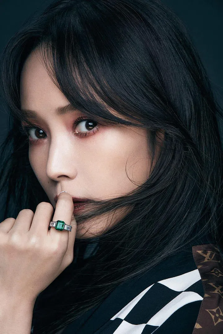 高级珠宝戒指, 铂金,祖母绿,钻石/Cartier。 格纹连衣裙/Louis Vuitton。