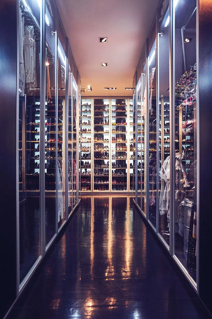 主卧室里诺大的开放式橱柜,展示夫妻俩多年来的珍藏。