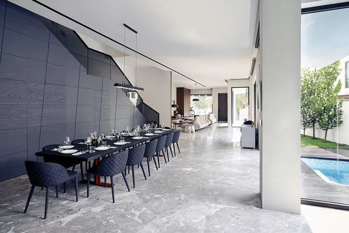 客厅到用餐区一气呵成没有隔间让空间看起来更宽敞;Lema火山石餐桌简约大气,是主人家跟家人与客人欢聚的地方。