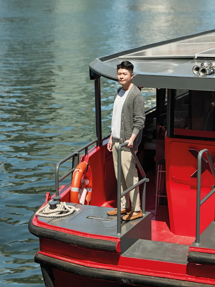 新加坡首艘以太阳能驱动的Pyxis R观光电动船于今年3月在滨海湾艺术科学博物馆正式亮相,为新加坡河游船业者WaterB提供更环保的观光接驳服务。本次拍摄所用的正是这款船只。船体采用铝制双体(aluminium catamaran)结构,不仅大幅提升稳定性,减少晃动,还能为乘客带来更平稳舒适的乘船体验,同时有效降低晕船的可能性。更令人惊讶的是,这艘电动船航行所需电力,仅相当于3至4台吹风机。