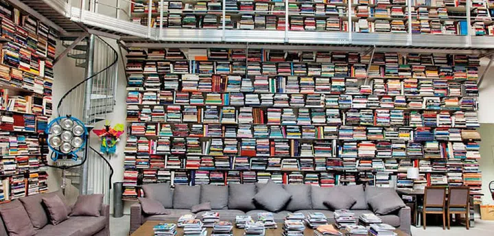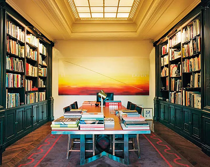 老佛爷收集的万本藏书从地板一直摆放至天花板,运用黑白经典配色的书架、平台和旋转楼梯呈现简约摩登感。仔细观察,还会留意到不少贴心的细节处理:装有滑轮的梯子和小型楼梯能帮出取得高物;由于书籍都是平放堆叠,因此墙面上贴满了目录,让书名一目了然。这里并非他的全部收藏,还有另一部分书籍存放在他的巴黎工作室。