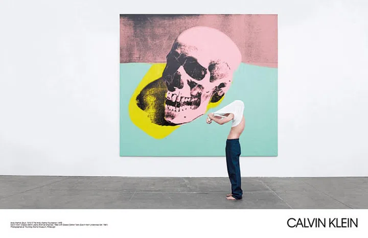Raf Simons 加入Calvin Klein 后推出的首支广告,图中画作为Andy Warhol的“Skull”系列作品。