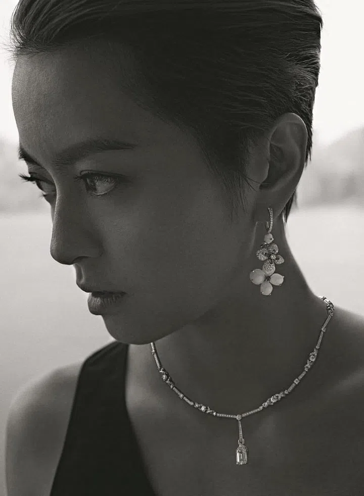 黑色丝绸雪纺蕾丝裙/Valentino; Josephine Rondes de Nuit白金镶嵌明亮式切割钻石项链;Abeille 石榴石与粉色碧玺镶嵌明亮式切割钻石戒指;Liens白金镶嵌明亮式切割钻石及单颗枕形切割蓝宝石戒指/Chaumet。