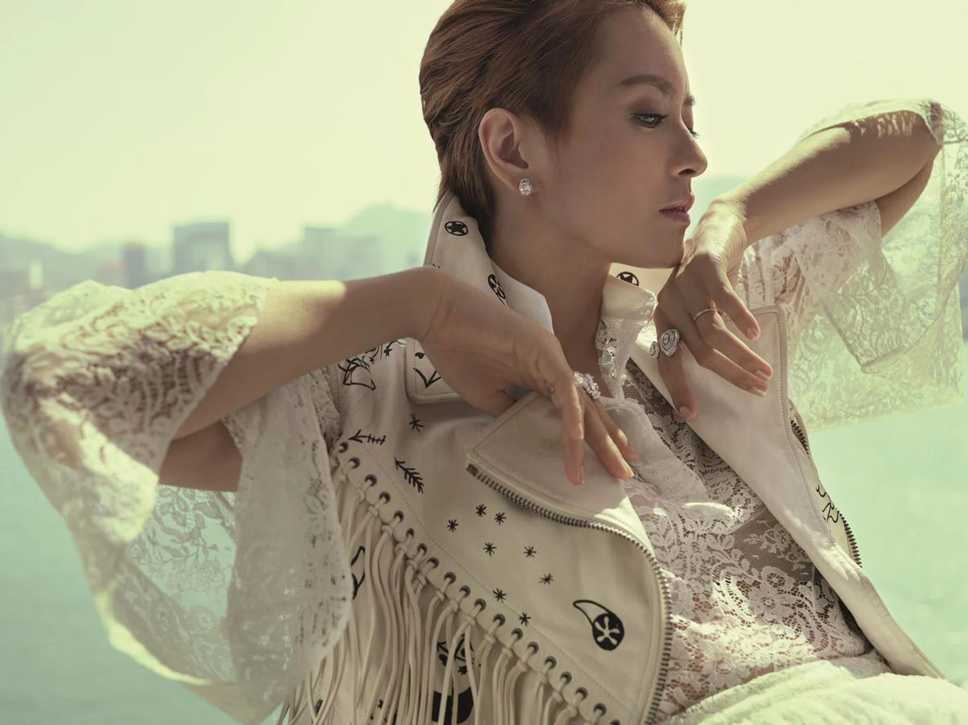 不同时期的封面摄影折射出梁咏琪的星路历程,也记录了当下的环境和社会面貌。2005年初春到香港拍摄Gigi,灰蒙蒙的三月天,报纸头条赫然是“董建华辞职,香港迎晴天”。这回重访旧地,当地民主派人士走上街头抗议中国人大释法,与警方起冲突。社会从不停止动荡,但梁咏琪仍是那个短发明眸的高妹,结婚生女后更添几分成熟韵味,在星光逐渐暗淡的乐坛里兀自唱着希望的歌,继续发亮。