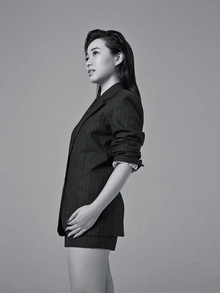 “珍”燕窝创始人陈妍宁羊毛条纹外套、短裤、高跟鞋/Versace