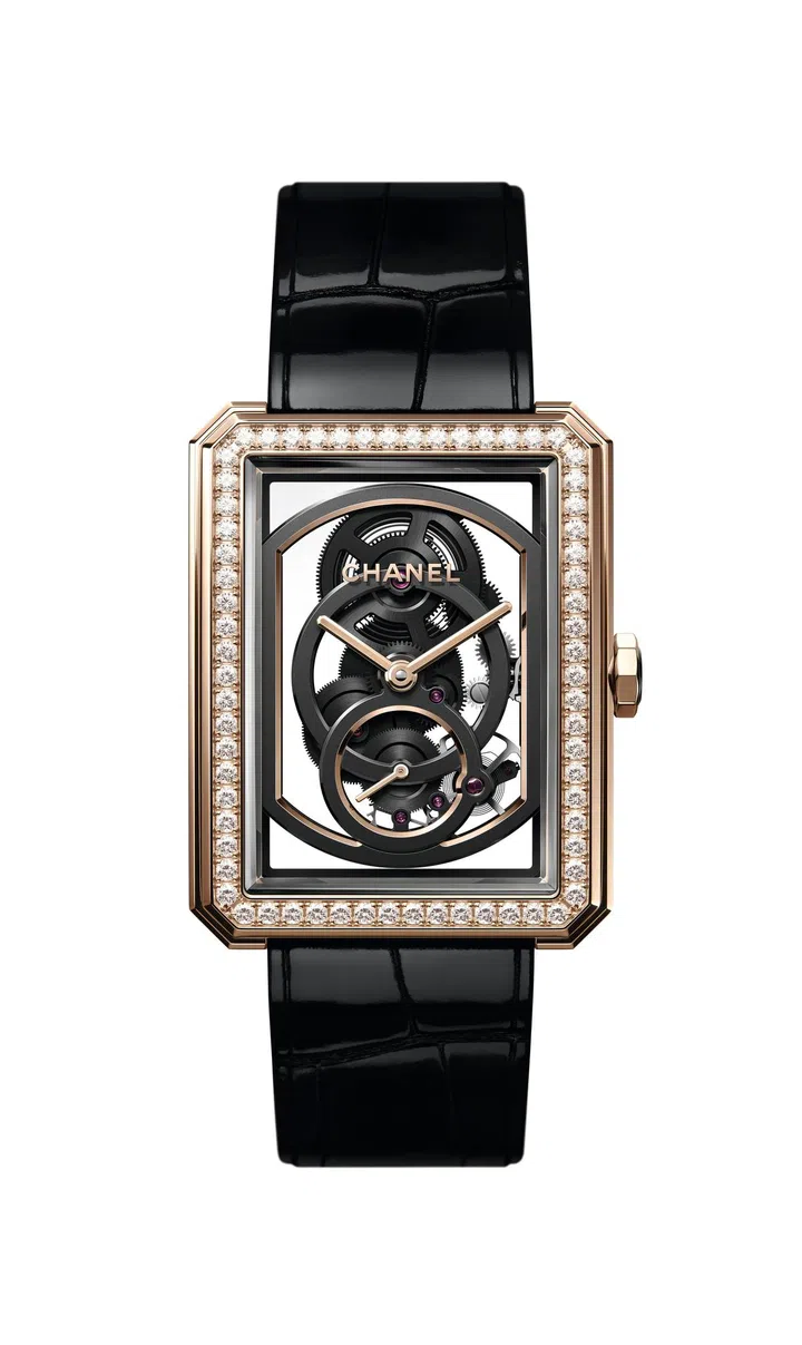 经过三年的研发,香奈儿(Chanel)终于发布了自制的Calibre 3机芯,机芯悬浮于八角形的米色金表壳内,呈现出一系列相互连接、垂直错落、精准相连的圆形。米色金的倒脚经过了镜面抛光工艺,展现了机芯的深度。Boy-Friend镂空腕表的设计将Calibre 3的机械美态尽显无遗。