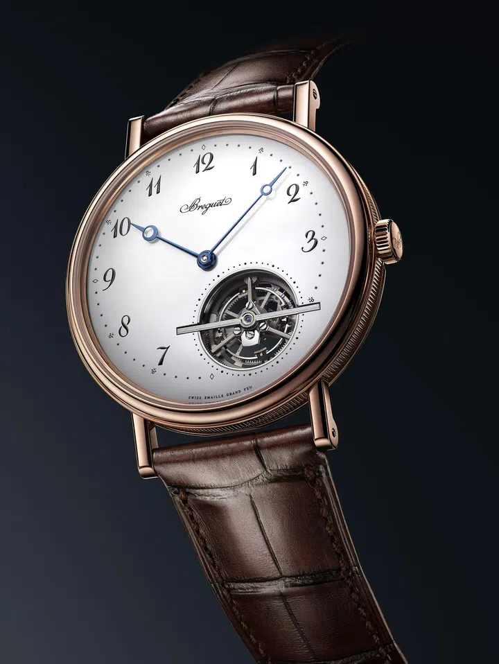 宝玑(Breguet)于2013年推出的5377超薄陀飞轮腕表至今仍为人津津乐道,而作为品牌今年的首款新作,5367超薄自动上链陀飞轮腕表拉开了巴塞尔钟表展的序幕。这是经典复杂系列(Grandes Complications Collection)中首款采用大明火珐琅表盘的腕表,极简的表盘突出了陀飞轮的纯粹。看似朴实无华,其搭载的581机芯却精妙绝伦。自动陀围绕机芯外围摆动,如此一来,使得机芯构造一览无余,同时也确保了机芯的纤薄。