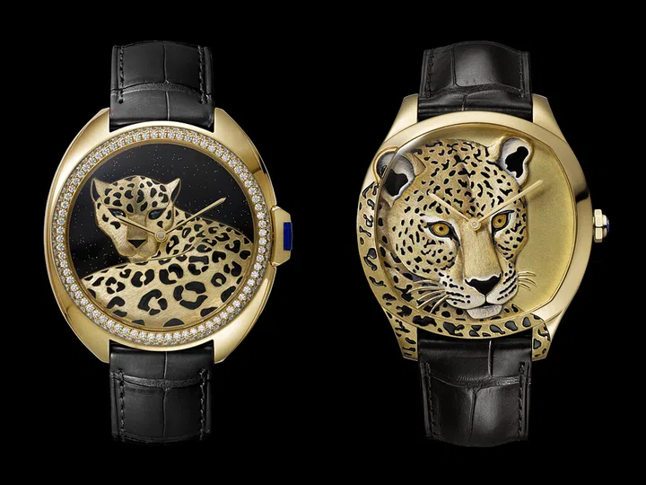Cle de Cartier Panther Decor腕表,黄金表壳镶嵌明亮式切割钻石,黄金表盘上镶嵌祖母绿作猎豹眼睛,黑色珐琅豹纹;Drive de Cartier Panther Décor腕表,黄金表壳,黑色珐琅豹纹。