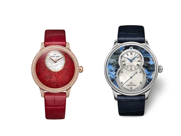 Petite Heure Minute 2018年情人节限量版腕表,红金表壳搭配红色织锻表带,赤铜矿表盘,珍珠母贝分显示盘;Grande Seconde Blue Pietersit腕表,蓝色彼得石表盘,中央镶饰白色珍珠母贝。
