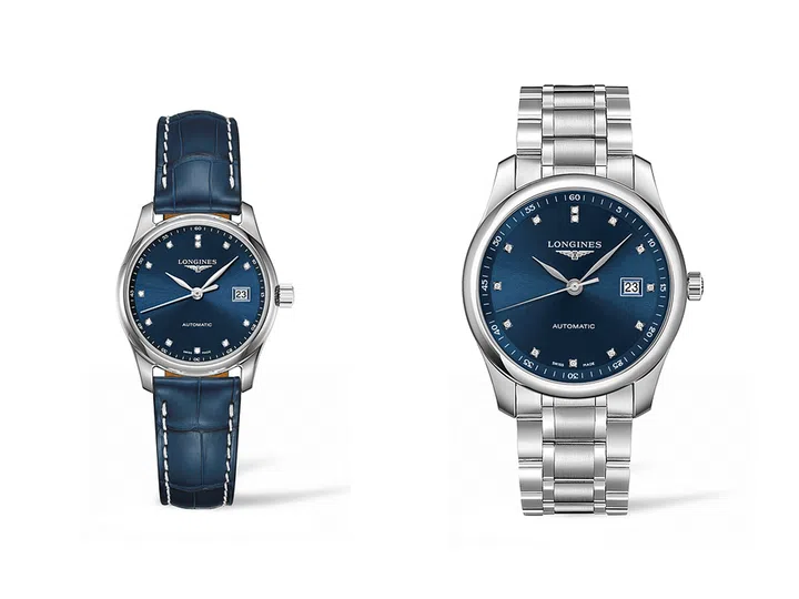 Master系列自动上链29毫米女装腕表( L2.257.4.97.0),精钢表壳,蓝色表盘搭配蓝色表带;Master系列自动上链40毫米男装腕表(L2.793.4.97.6),精钢表壳,蓝色表盘搭配精钢表链。