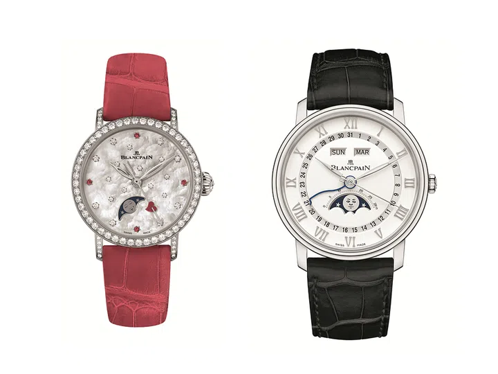 2018年情人节款腕表,来自Villeret 系列,白色珍珠母贝表盘上镶嵌19颗钻石与四颗红宝石,表圈镶嵌48颗钻石,表耳镶嵌20颗钻石,6点钟位置的月相盘呈现“月亮美人”笑脸;Villeret系列Quantieme Complet腕表,搭载6654自动上链机芯,配备全历-月相功能。