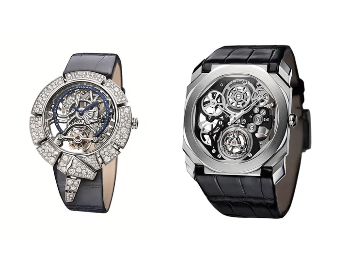 Serpenti Incantati Tourbillon腕表,白金表壳铺镶钻石搭配蓝色真皮表带;Octo Finissimo Tourbillon Skeleton腕表,铂金表壳搭配黑色真皮表带。