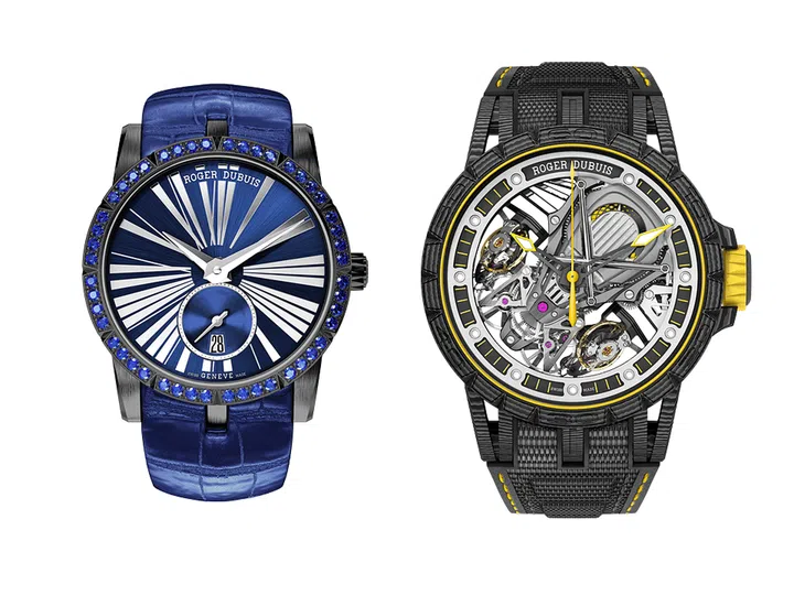Excalibur 36自动上链腕表,搭配黑色DLC涂层钛合金表壳与镶嵌有48颗蓝宝石的表圈;Excalibur Aventador S腕表,与Lamborghini Squadra Corse 合作系列,45mm Excalibur Spider复层碳纤维镂空表壳,搭载D103SQ双游丝摆轮镂空机芯。