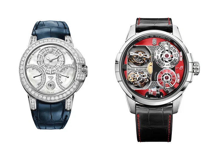 Ocean系列双逆跳功能42毫米自动腕表,珍珠母贝表盘镶嵌127颗圆形明亮式切割钻石,白金材质针扣镶嵌 44 颗圆形明亮式切割钻石, 搭配白金材质折叠表扣 ,表壳镶嵌 180 颗圆形明亮式切割钻石;Histoire de Tourbillon 8号腕表, 配备两个通过球体差动装置相 联的双轴陀飞轮。