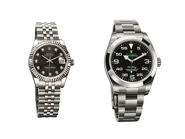 Oyster Perpetual Datejust 31腕表,钢与白金表壳,三角坑纹外圈,搭载劳力士2235型自动上链机芯;Oyster Perpetual Air-King腕表,40mm精钢表壳,磨光外圈,搭载劳力士3131型自动上链机芯。