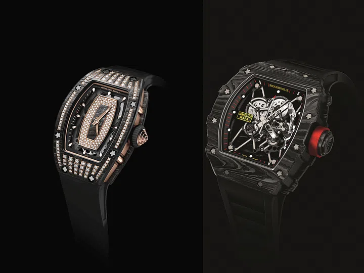 RM 07-01腕表,NTPT碳纤维材质表壳,配备5N红金表圈,镶嵌250颗钻石;RM 35-01 Rafael Nadal腕表,NTPT碳纤维材质表壳,搭载RMUL3机芯,动力储存55小时。