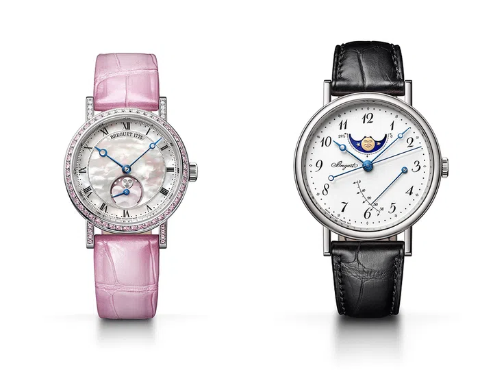 Classique Phase de Lune Dame腕表2018年情人节特别版,白金表壳,表圈镶嵌钻石与粉色蓝宝石,白色珍珠母贝表盘的6点钟位置设有月相显示,覆有粉色喷漆;Classique 7787 月相腕表,搭载自动上链机芯,置有动力储备和月相盈亏显示,白色大明火珐琅表盘带宝玑阿拉伯数字时符和隐蔽签名。