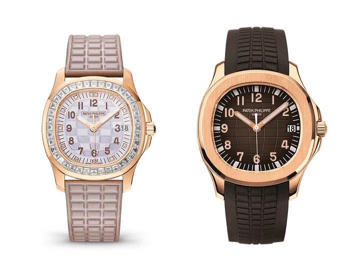 Ref. 5072 Aquanaut Luce高级珠宝腕表,雕刻处理的珍珠母贝表盘带有双色调米色棋盘格图案,表圈镶嵌40颗总重约2.76克拉的长形钻石;Ref. 5167R Aquanaut腕表,棕色浮雕表盘,覆荧光图层的金质立体字块,玫瑰金表壳。