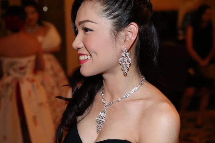 Bulgari 的高级珠宝耳环及项链让Angela Ng耀眼动人。