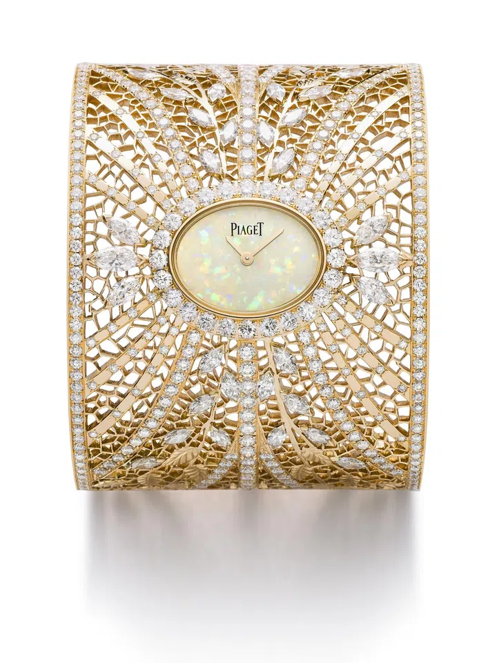 这只高级珠宝金质蕾丝手镯表的制作难度极高:装饰于腕表中心的椭圆型白色蛋白石表盘,由镶钻表框环绕,相邻的金质蕾丝,则由极其精巧的雕刻叶型饰纹装饰,配以爪镶马眼型切割或圆型切割钻石,为蕾丝增添了视觉感官上的华彩体验。