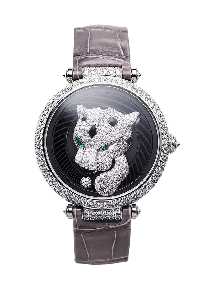 Panthere Joueuse猎豹装饰腕表将复杂功能与精致的雕刻工艺完美结合,钻石、黑漆、祖母绿,搭载品牌全新机芯,呈现出立体而生动的猎豹形象,机芯与豹身合为一体,豹头与豹爪显示分钟,圆球显示小时,设计别具一格,透露着品牌的精巧用心。