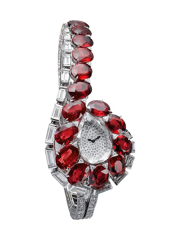 Trait D’ Eclat是枚晚装腕表,夜幕降临的暗影之中,红宝石闪耀着烈焰般的灼热光芒。15颗红宝石色彩匀净通透,难得一见。莫桑比克红宝石的独特之处便是深邃而浓烈的红色金刚光泽中略带粉橙色,让人对它爱不释手。红宝石宛若红色丝带缱绻环绕腕表,与长阶梯形切割钻石形成巧妙对比。簇拥在表盘四周的圆环与整体布局浑然融合。臻美腕表点缀腕间,显露细腻柔美风情。