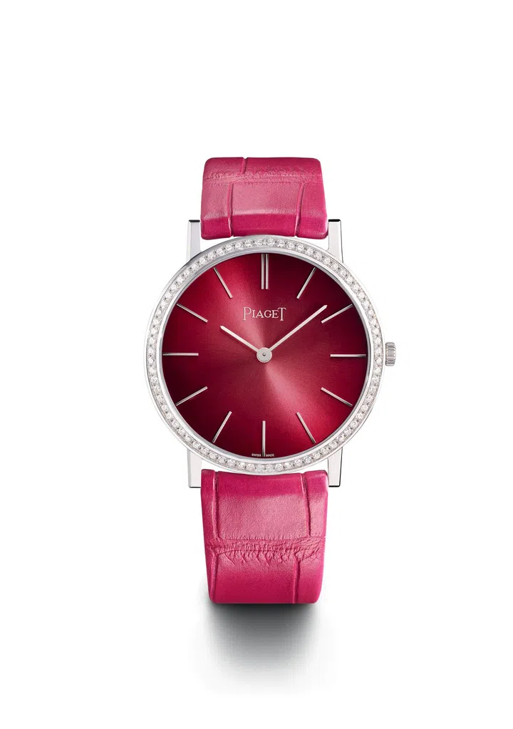 伯爵在1957年推出了一款革命性的超薄腕表Altiplano,纤薄的表壳在当时成为一代传奇。2017年, 品牌推出了该系列的60周年特别限量款纪念这一伟大杰作。其中女装款式的粉红色表盘配以相同颜色的鳄鱼皮表带格外吸引人们的眼球,其中又以白金表壳镶钻的那只更加耀眼夺目。透露着可爱而温柔的女性气质。