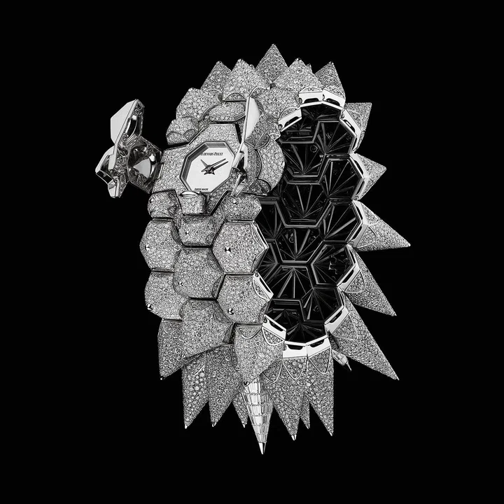爱彼在本届日内瓦钟表展上全新推出Diamond Outrage高级珠宝腕表是这一“三部曲”的最终章,融合了两款前作Diamond Punk和Diamond Fury的非凡魅力,以及明亮型切割美钻的璀璨光芒。Diamond Outrage是一款极为特别的手镯腕表,爆炸式设计让人眼前一亮。这款高级珠宝腕表共有两种款式,均采用18K白金材质,一款铺镶钻石,一款铺镶蓝宝石。