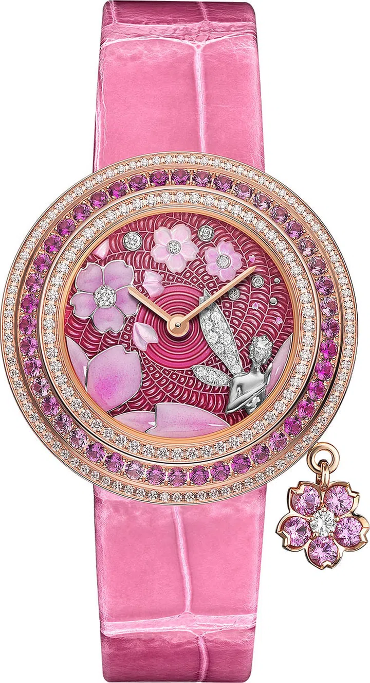 另一个新成员是以盛开的樱花为灵感的Charms Extraordinaire Fee Sakura 腕表,深粉色的珍珠母贝表盘上,樱花的线条被勾勒得极为细腻,表盘前排的花朵缀以凸圆形珐琅,乳白色的花瓣隐约有着透视感,层次立现。