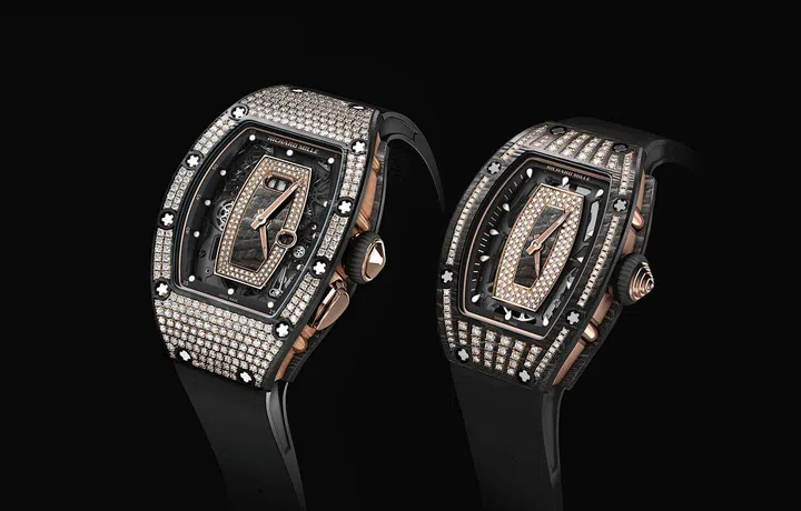 Richard Mille将品牌男士腕表的NTPT碳纤维运用在女装腕表上,配以镶钻的全新方式,既给机芯最佳的保护,又彰显了女人的韵味,这便是两款全新的女装腕表RM07-01与RM037。全手工抛光的红金或白金材质的金属爪牢牢将250颗钻石固定在腕表上,展现的是制表师卓绝的技艺。