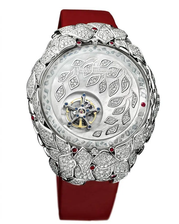 在SIHH2017上推出的几款Hybris Artistica Mysterieuse超凡复杂工艺神秘腕表系列搭载积家全新的941型机械机芯,配备全新轨道式飞行陀飞轮、全新摆陀、以及全新外观框架。这款限量发行 3 枚的女装腕表分别采用白、蓝、红三色设计,融合了积家珍稀工艺(Metiers Rares)大师们的超卓技艺,采用镂空工艺、雪花镶嵌工艺等将钻石镶嵌在白金表壳上,叶子叠搭极具层次感,树叶之间还点缀着红宝石或蓝宝石,表盘采用纯净的珍珠母贝,突显女性美丽、神秘、优雅的特质。