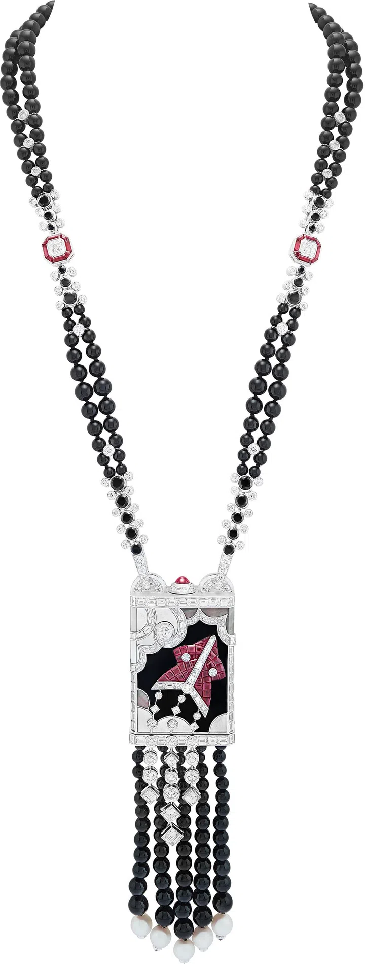 长项链︰白 K 金、圆形、丁方形及长方形切割钻石、 圆形、长方形及蛋面切割红宝石、圆形黑尖晶石、 缟玛瑙圆珠、白色养殖珍珠