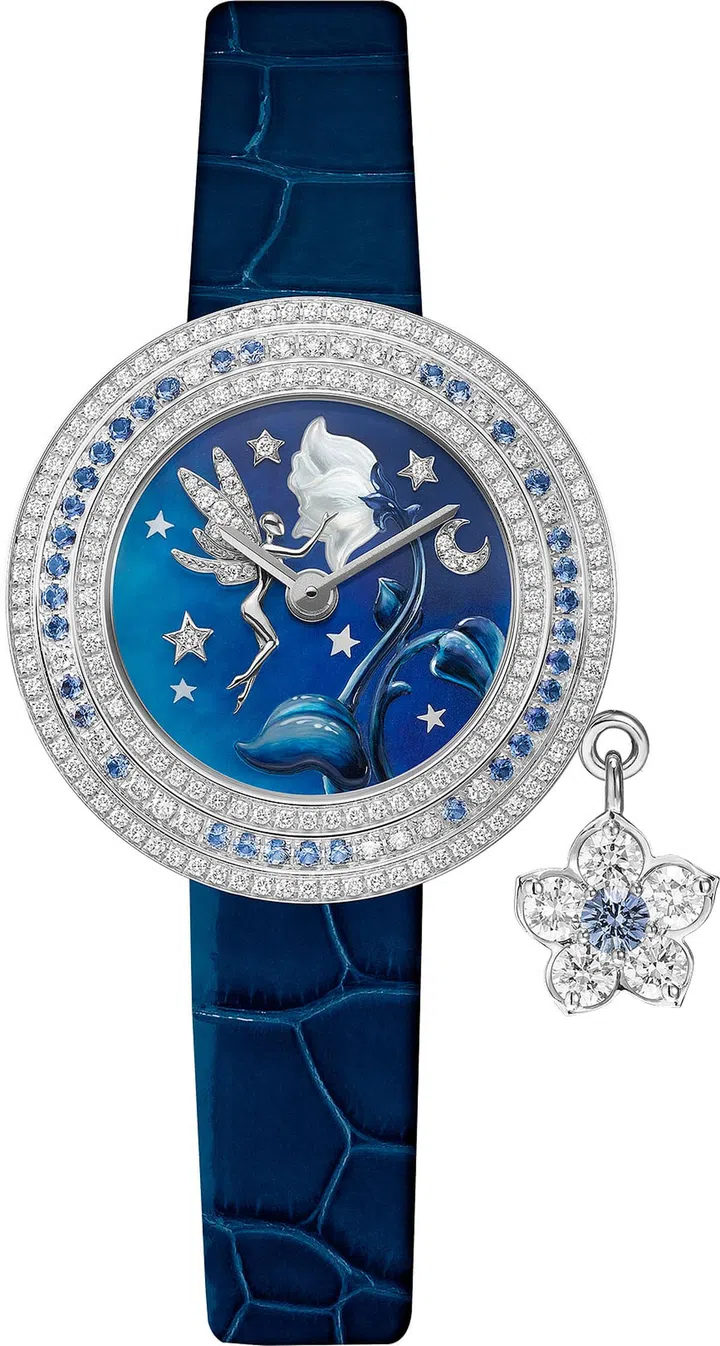 非凡工艺表盘(Extraordinary Dials)系列在此次表展中亮相了一对新成员,其中一枚是以大自然与仙子为灵感来源的Charms Extraordinaire Fee Rose de Nuit腕表。白K金和钻石刻画的仙子正在仔细欣赏珍珠贝母上的雕花,在午夜深蓝的星空背景下衬托得尤为别有意境。