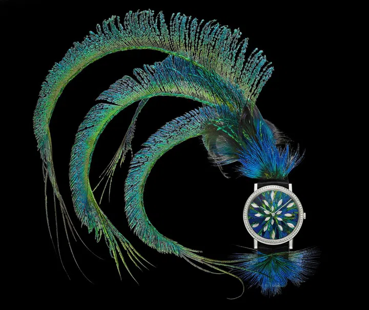 38毫米18K白金材质,镶嵌78颗圆形切割美钻(约0.71克拉) 表盘以鸭、孔雀、公鸡羽毛细工镶嵌,部分构图由银质叶片覆盖